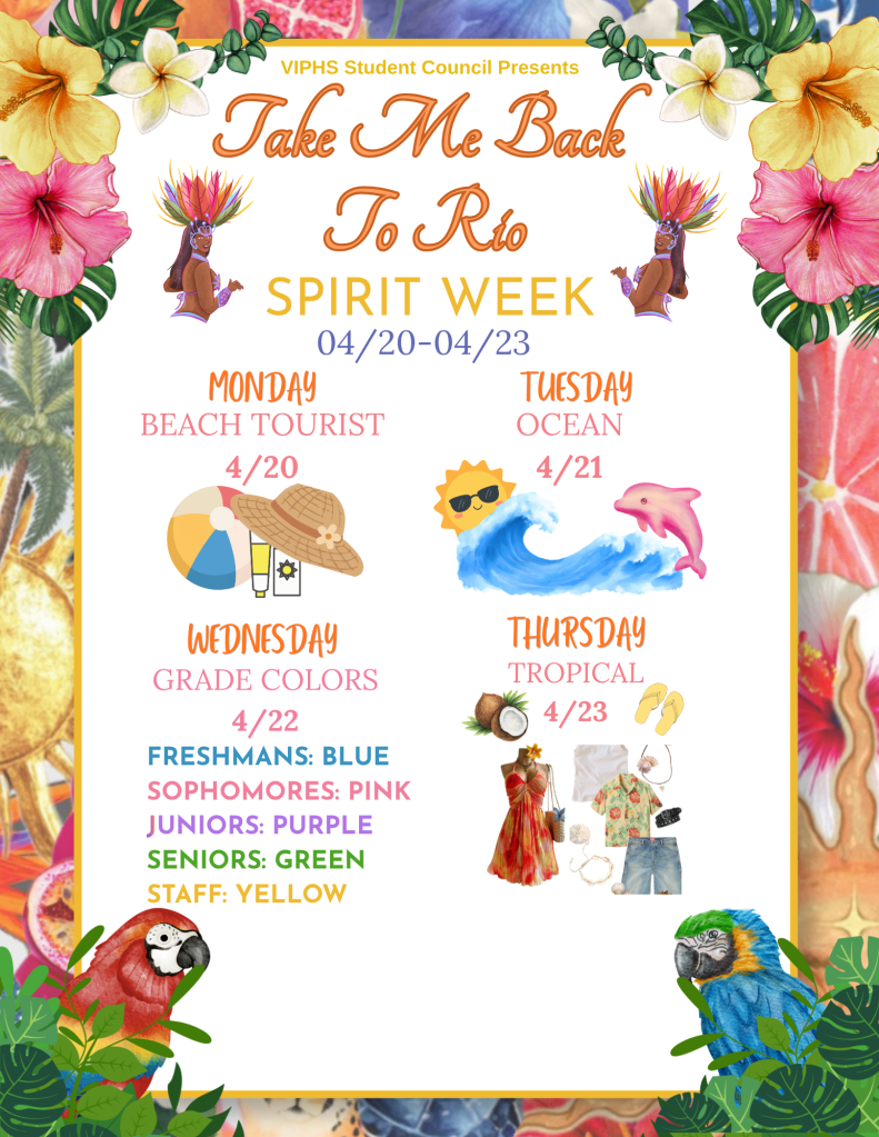 To accompany the excitement of our dance, we also have a spirit week starting on 4/20 lasting through 4/23. Monday will be beach tourist day, wear your flip flops and fedoras. Tuesday is ocean day, take it as you will, from marine animals to waves, the sea is your oyster. Wednesday dress in your grade colors, see the flyer below for your assigned color. Make sure you go all out and show your school spirit, we’re talking head to toe color blackout. Last but not least Thursday (no school on Friday) is tropical day in preparation for our Rio themed dance. We look forward to seeing all these vibrant outfits and everyone showcasing their school spirit.